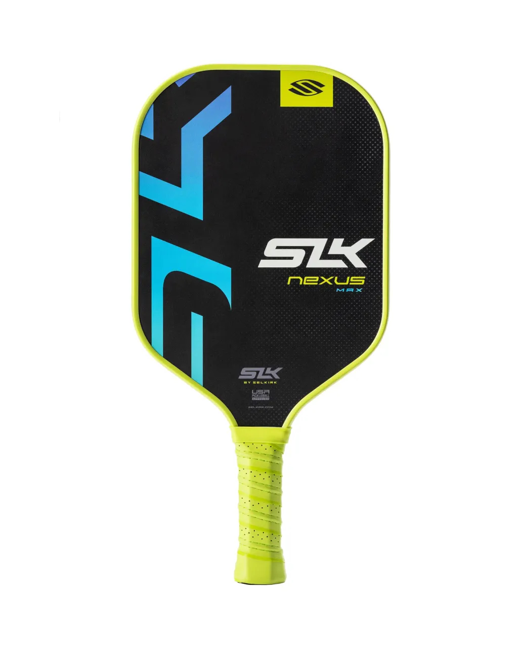 The SLK Nexus Max paddle is for beginner pickleball players looking for a control pickleball paddle. Made with a fiberglass-wrapped honeycomb core, the SLK Nexus Max will give pickleball players an exceptional combination of control and power on the court. Available in the Max paddle shape. Max | Maximum Sweet Spot & Largest Surface Area Offering the largest surface area and sweet spot of all paddle shapes, the Max is designed to provide balanced players with unparalleled performance on the court. With its maximum sweet spot and generous surface area, the Max shape delivers optimal power and control, making it the ideal shape for players of all skill levels. Behind the Product Unleash your inner champion with the Nexus Max pickleball paddle. This premium starter paddle offers unmatched durability and consistent performance, making it ideal for beginners seeking to dominate the court. The innovative fiberglass-wrapped honeycomb core delivers the perfect blend of power and control for explosive shots and pinpoint accuracy. A comfortable grip and wrapped edges ensure long-lasting enjoyment, keeping you on top of your game season after season. Product Features SpinFlex Textured Surface | The SpinFlex Textured Surface is designed to increase spin consistency and ball control. This makes it easier to hit drop shots, dinks, and volleys with precision. G4 Fiberglass Face | The G4 Fiberglass Face is developed to give you consistency, control, and power. This durable face is perfect for both offensive and defensive players. 13mm SX4 Polymer Core | The 13mm SX4 Polymer Core combines a powerful paddle interior with a large sweet spot. This ensures that you get a consistent feel on every shot, no matter where you hit the ball. Edgesentry | Low-profile, lightweight, durable edge guard for a well-balanced, solid paddle. Tech Specs Weight Range: 7.8-8.2 oz Grip Circumference: 4.25" Grip: SLK Comfort Contour Handle Length: 4.85" Paddle Length: 16” Paddle Width: 7.85" Face: G4 Fiberflex Core: SX4 Polymer Honeycomb Core Core Thickness: 13mm Spin Texture: Spinflex Edgeguard: Edgesentry Designed and Quality Controlled in the USA