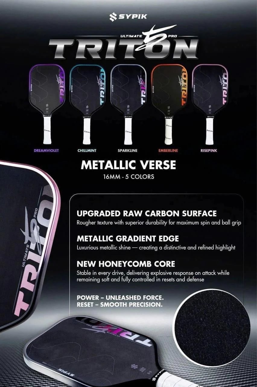 🌀 Sypik Triton 5 Ultimate Pro Metallic Verse Edition (16 mm) Unleash the next evolution of performance with the Sypik Triton 5 Ultimate Pro, engineered for players who demand both explosive power and refined control. The new Metallic Verse Series brings five vibrant gradient finishes Dream Violet, Chill Mint, Spark Line, Ember Line, and Rise Pink for a paddle that performs as boldly as it looks. Key Features: Upgraded Raw Carbon Surface – Rougher, more durable carbon texture built for maximum spin, dwell time, and consistent ball grip. Metallic Gradient Edge – Precision-milled metallic edge with a radiant gradient shine that adds strength and unmistakable style. New Honeycomb Core (16 mm) – Stable through every drive, delivering explosive response on attacks while staying soft and controlled in resets and defense. Power Meets Precision – Designed for advanced and all-court players seeking a perfect balance between force and finesse. Play Style: Power / All-Court Skill Level: Intermediate to Advanced Thickness: 16 mm Available Colors: Dream Violet | Chill Mint | Spark Line | Ember Line | Rise Pink
